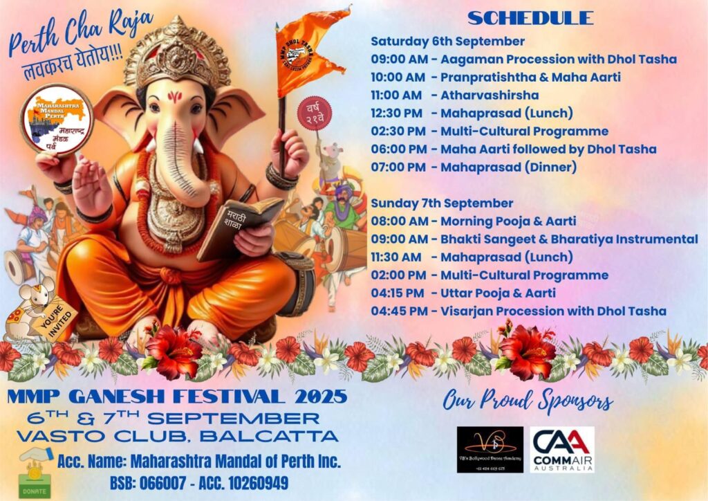 Perthcha Raja, Maharashtra Mandal Perth cha Ganpati is arriving in Perth on the 6th September for two days at Vasto Club, Balcatta! Let’s get started on making grand preparations for an even grander GANESHOTSAV.